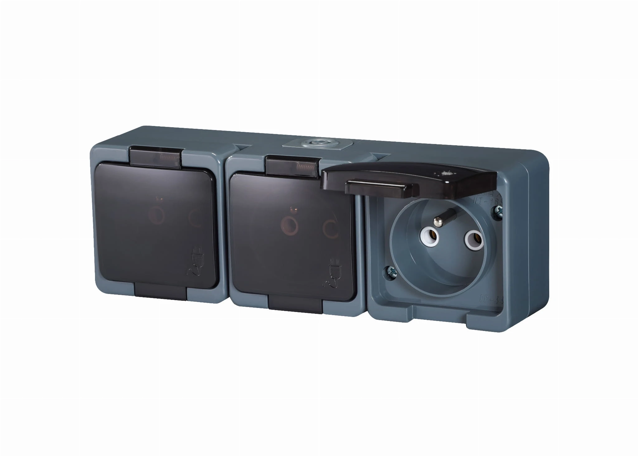 Gniazdo wtyczkowe potrójne 3x 2P+Z bryzgoodporne z klapką dymną IP44